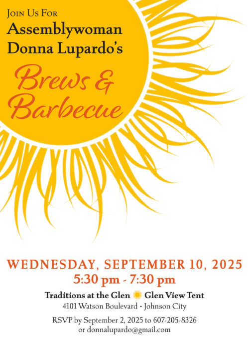 Brews & BBQ – September 10th, 2025 AdminAugust 4, 2025Events RSVP by September 2nd RSVP online by clicking here or contact 607-205-8326 or donnalupardo@gmail.com