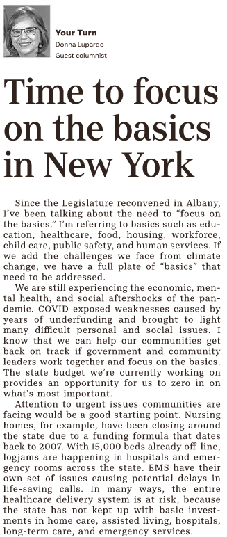 Since the Legislature reconvened in Albany, I’ve been talking about the need to “focus on the basics.” I’m referring to basics such as education, healthcare, food, housing, workforce, child care, public safety, and human services. If we add the challenges we face from climate change, we have a full plate of “basics” that need to be addressed.